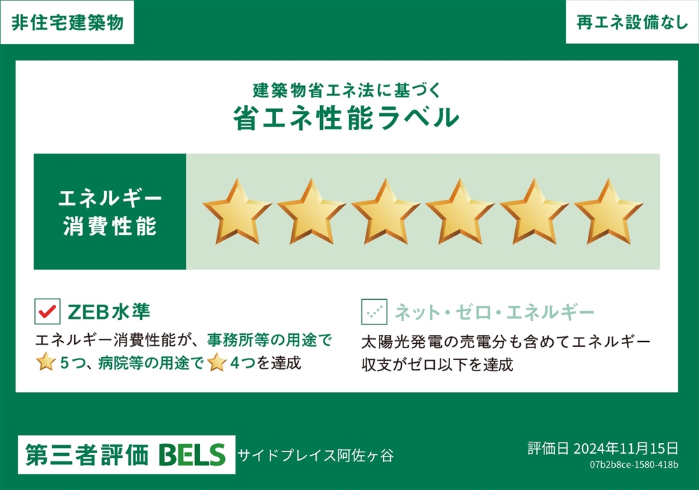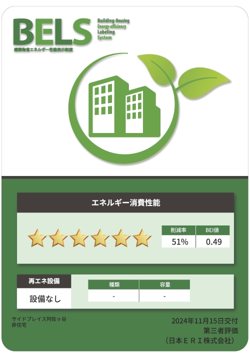 The Building-Housing Energy-efficiency Labeling System (BELS) is a system in which a third-party organization evaluates and certifies the energy-saving performance of buildings. This evaluation aims to contribute to building a sustainable society by providing an at-a-glance view of a building's energy efficiency. In addition, BELS-certified buildings are proven to have high energy efficiency. They are expected to reduce the impact on the environment and operating costs.